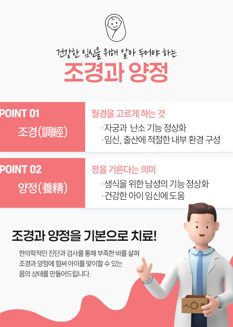 한약 처방 및 추가적인 한의학 치료를 통하여 여성분들은 조경을, 남성분들은 양정을 신경 써 관리하고 있습니다. 조경이라는 것은 월경을 고르게 하는 것을 의미하는데요. 정상적인 월경이 이루어지지 않는다는 것은 그 자체만으로도 자궁, 난소 기능에 문제가 있음을 뜻하는 것으로 자연스럽게 임신에도 차질을 빚는 원인이 될 수밖에 없습니다.