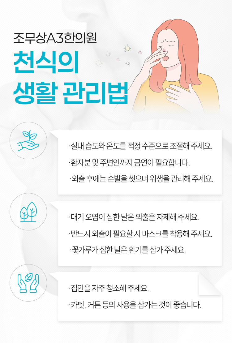 천식은 영유아기에 발병하여 성인까지 이어지는 경우도 있고, 성인이 되어서 처음 발생하는 경우도 있으며, 어린 시절 천식이 있었던 천식이 사그라드는 듯하다 뒤늦게 다시 나타나는 경우도 있습니다. 따라서 관련한 증상에 노출되었다는 생각이 들 때, 늦지 않게 관리해 나가려는 것이 중요합니다. 조무상A3한의원에서도 개인의 상태에 따른 대현동 천식치료를 통해 건강한 회복까지 도움을 드리고 있습니다.