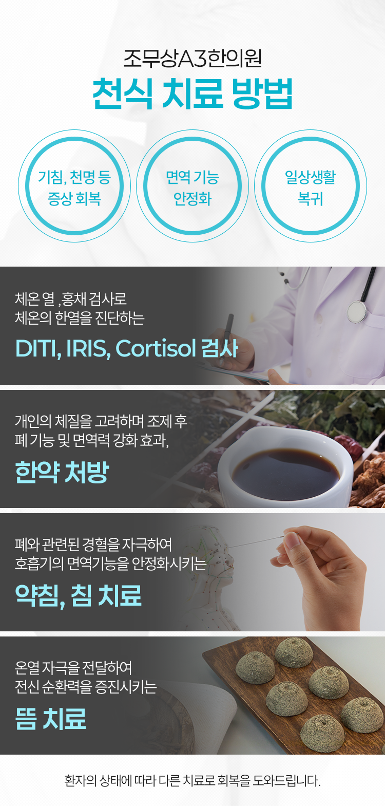 조무상A3한의원에서는 내원하신 환자분의 상태를 다각도로 살피는 것을 우선 순위에 두고 있습니다. 같은 천식 환자라도 어떤 환경에서 증상이 악화되고, 증상의 심각성은 어떠한지와 같은 내용이 다르기 때문입니다. 따라서 DITI, IRIS, 코르티솔 검사, 문진 등을 통해 한 사람, 한 사람의 상태를 파악하고 있습니다. 이후로는 천식에 관련된 증상을 회복하고 면역 기능을 바로잡을 수 있도록 한의학적인 치료를 진행해 보실 수 있습니다.
