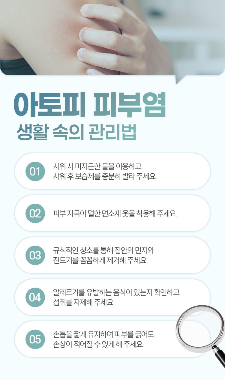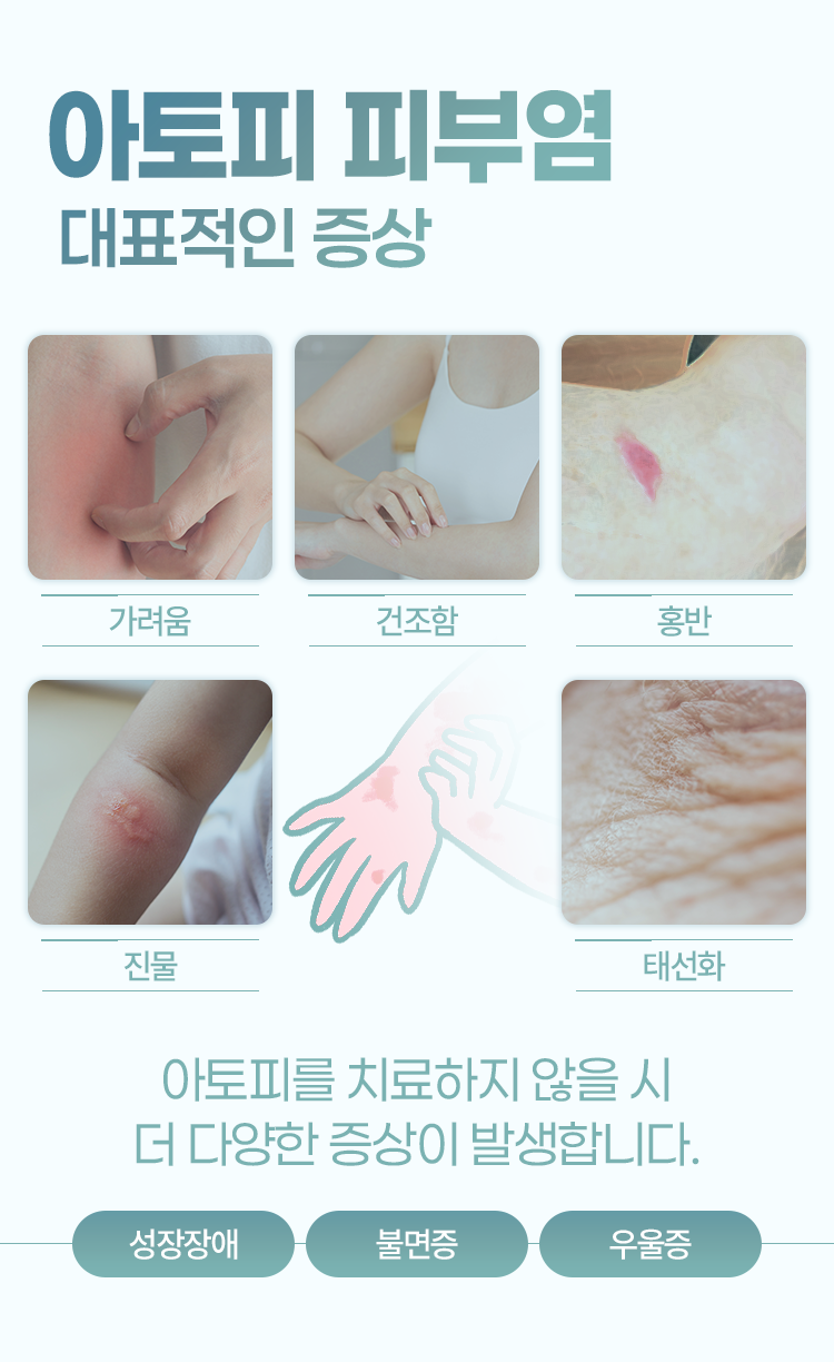 아토피가 유독 괴로운 이유는 참을 수 없을 정도로 심한 가려움증 때문이라고 할 수 있겠습니다. 특히 밤에 더 심해지는 경향이 있어서 잠을 설치게 되는데요. 가려워서 긁다 보면 피부가 손상되고, 손상된 피부는 더 가려워지는 악순환이 반복됩니다. 만성적인 가려움증은 집중력 저하와 수면 장애를 일으켜서 일상생활에 큰 지장을 줍니다. 피부는 항상 건조하고 거칠며 하얀 가루가 일어나는 것처럼 보여, 보습제를 발라도 금방 건조해지고 당길 수 있습니다.