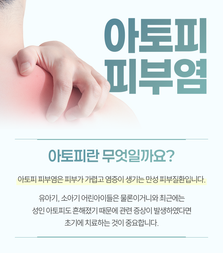 아토피란 만성적으로 재발하는 양상을 보이는 염증성 피부 질환의 일종이자 습진질환의 한 종류이기도 합니다. 심한 가려움증과 피부 건조증을 특징으로 한다고 말씀을 드리며 보통 생후 2개월~3개월 사이에 처음 나타나는 경우가 많습니다. 성장하면서 가라앉기도 하지만 반대로 시간이 충분히 흘렀음에도 불구하고 계속 상태가 악화될 수 있으며, 또 어떤 경우에는 소아기나 청소년기, 성인이 된 이후처럼 다양한 시점에 갑작스럽게 발병을 하게 되는 일도 있습니다. 그렇기 때문에 원인 및 증상에 대해 미리 파악해 두고 상태를 치료하기 위한 노력을 기울이심이 중요하다고 강조하는 말씀을 전해드리고 싶습니다.