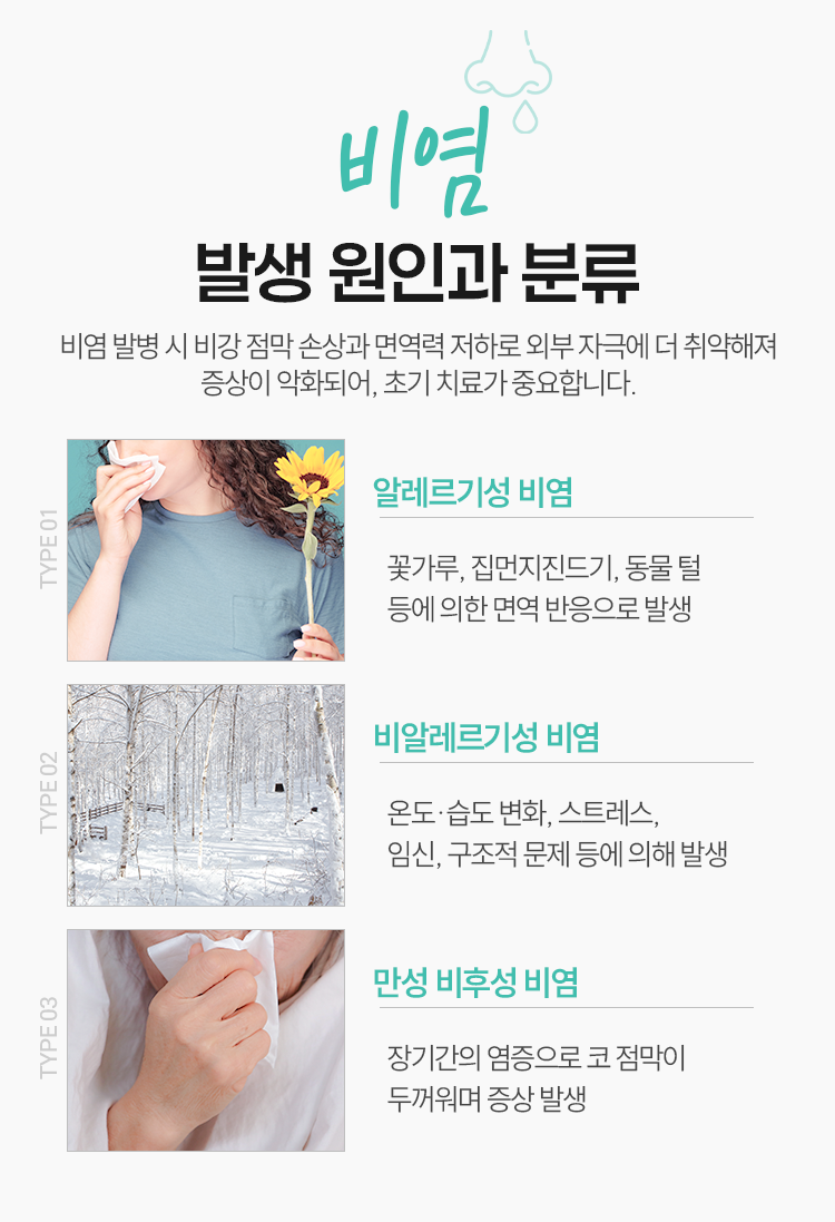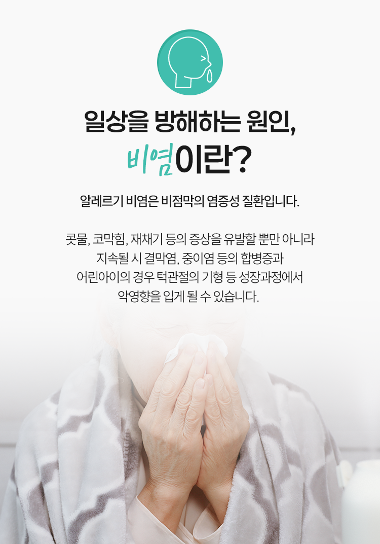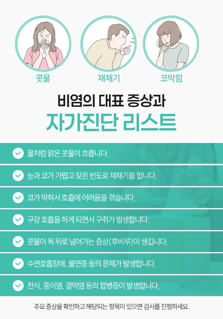 비염은 어릴 적 발병하여 성인이 된 이후까지 계속 영향을 주는 경우가 있는가 하면, 말짱하다가도 성인이 되어서 갑작스럽게 증세가 나타나기도 합니다. 또한 비염 유형에 따라 평소에는 아무렇지 않다가 뜨거운 음식을 먹으면 콧물을 참기 힘들어지는 식으로 특정 상황 속에서만 증세가 발현되는 경우도 있습니다. 다양하고 복합적인 상황 속에서 문제가 일어나는 것이기 때문에 검진을 통해 상태를 자세히 알아 나갈 수 있도록 노력하는 게 중요하다는 점을 강조하며 말씀드리고 싶습니다.