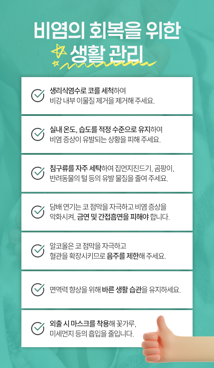 이러한 주요 증상 외에도 비염은 다양한 부수적 증상들을 동반합니다. 후각 기능이 떨어져서 음식 맛을 제대로 느끼지 못하거나, 코막힘으로 인한 입 호흡이 지속되면서 목이 자주 마르고 아프게 됩니다. 또한 코와 연결된 부비동에도 영향을 미쳐서 두통이나 얼굴 부위의 압박감을 느끼기도 하며, 만성적인 피로감과 집중력 저하를 경험하는 분들도 많습니다. 더하여 각종 합병증의 가능성도 가지고 있기 때문에 비염을 더욱 조심하셔야만 합니다.