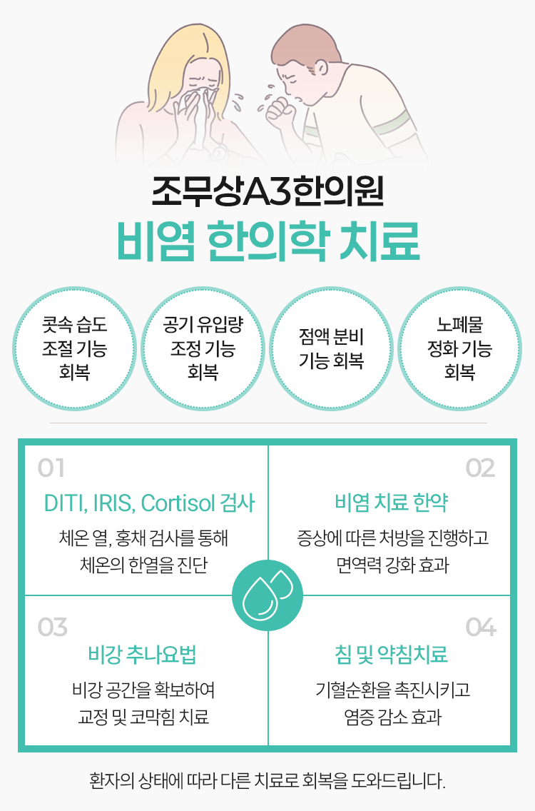 안녕하세요. 조무상A3한의원입니다. 아침에 일어나자마자 시작되는 재채기와 콧물로 하루를 시작하는 것이 일상이 되어버린 분들이 많으실 것입니다. 요즘 같은 환절기에는 직장에서 회의 중에 갑자기 찾아오는 재채기나 끊임없이 흘러내리는 콧물 때문에 민망한 상황을 겪어보신 적도 자주 있으실 텐데요. 처음에는 감기인 줄 알고 약국에서 감기약을 사서 드셔봐도 별다른 효과가 없고, 오히려 시간이 지날수록 증상이 더 심해지는 경우가 많습니다.