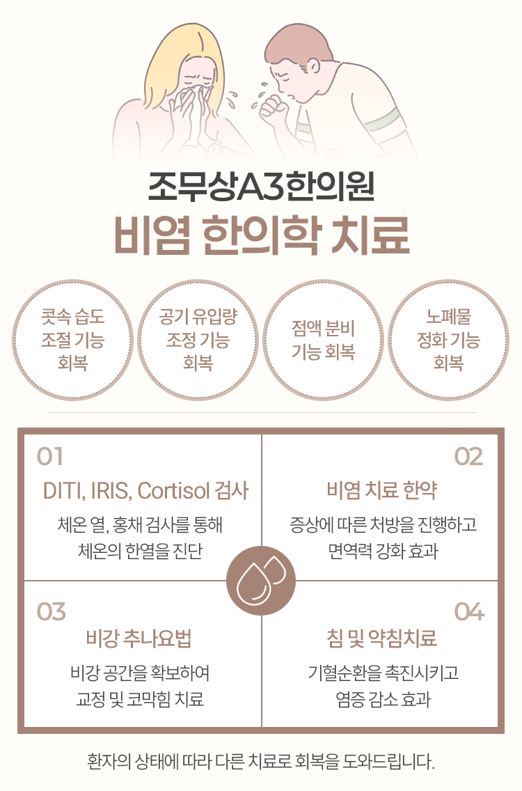 그렇기에 비염은 건강한 생활의 영위를 위해서라도 조속하게 치료할 수 있도록 해 주어야 합니다. 조무상A3한의원에서는 치료에 대한 구체적인 안내와 더불어, 생활 속에서의 관리를 어떻게 진행해야 하는지까지 하나하나 설명을 도와드리고 있는데요. 내원하신 후에 도움받아 보시면 되겠습니다. 감사합니다.