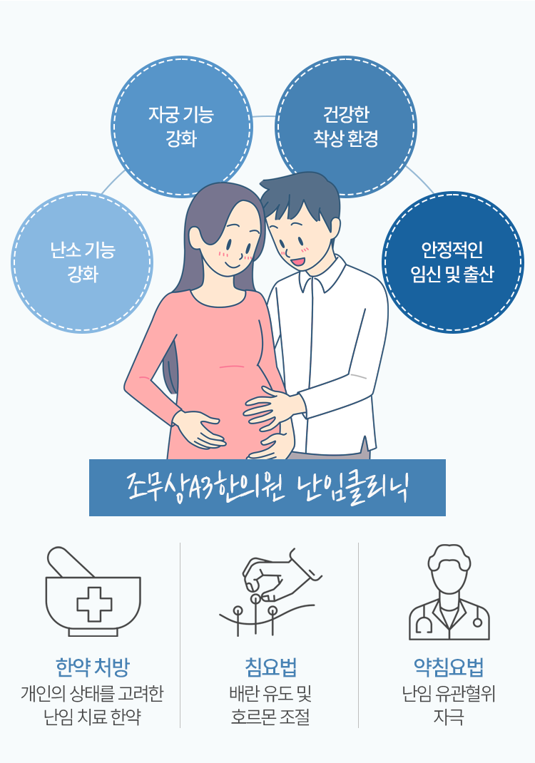 한두 차례 임신이 이루어지지 않았다고 해서 난임이라는 진단이 내려지는 것은 아닙니다. 기본적으로 난임은 35세 미만의 경우에는 1년 이상, 35세 이상의 경우 반년 이상 정상적으로 부부관계를 진행하고 있음에도 불구하고 임신이 되지 않을 때를 기준으로 삼고 있습니다. 당장 아이 계획이 급한 것이 아닐지라도 해당 기준을 충족하고 있다면 대구난임 치료를 받아 보실 것을 권유드립니다. 보통 나이가 들수록 임신의 가능성이 낮아지기 때문에 미리 관리를 진행하고 이상이 있지는 않은지 살펴 볼 수 있도록 해 주어야 합니다. 조무상A3한의원으로 걸음을 하시게 되면 어떤 문제를 겪고 있는지 구체적으로 내부의 상태를 파악해 나가는 데에 도움이 되어 드리고 있습니다. 그리고 이후로는 한약 처방, 침, 약침치료를 위주로 한 한방치료를 통해 건강한 임신과 출산에 대한 부분까지도 보탬이 되고자 노력합니다.