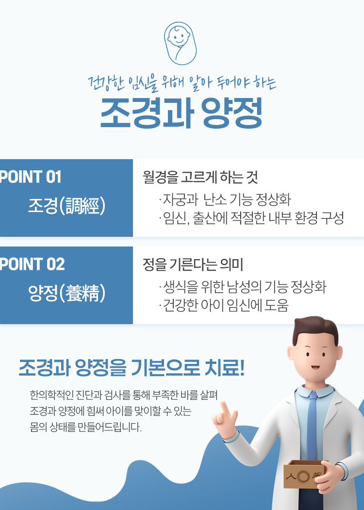 치료 시 중점적으로 여기는 것은 조경 그리고 양정입니다. 여기에서 조경이라는 것은 여성의 월경을 고르게 하는 것이라 생각해 주시면 됩니다. 아시다시피 여성은 사춘기 무렵 초경을 하게 되고, 그때부터 원활한 임신을 위한 준비를 해 나갑니다. 그러나 자궁이나 난소 기능 문제 등 여러 가지 요인에 의해 월경을 정상적으로 하지 못하는 여성분들도 많이 계십니다. 한방치료를 통해 이를 안정화시켜 준다면 여성 건강에도 도움이 되어 줄 뿐 아니라 임신에도 보탬이 되어 드립니다.